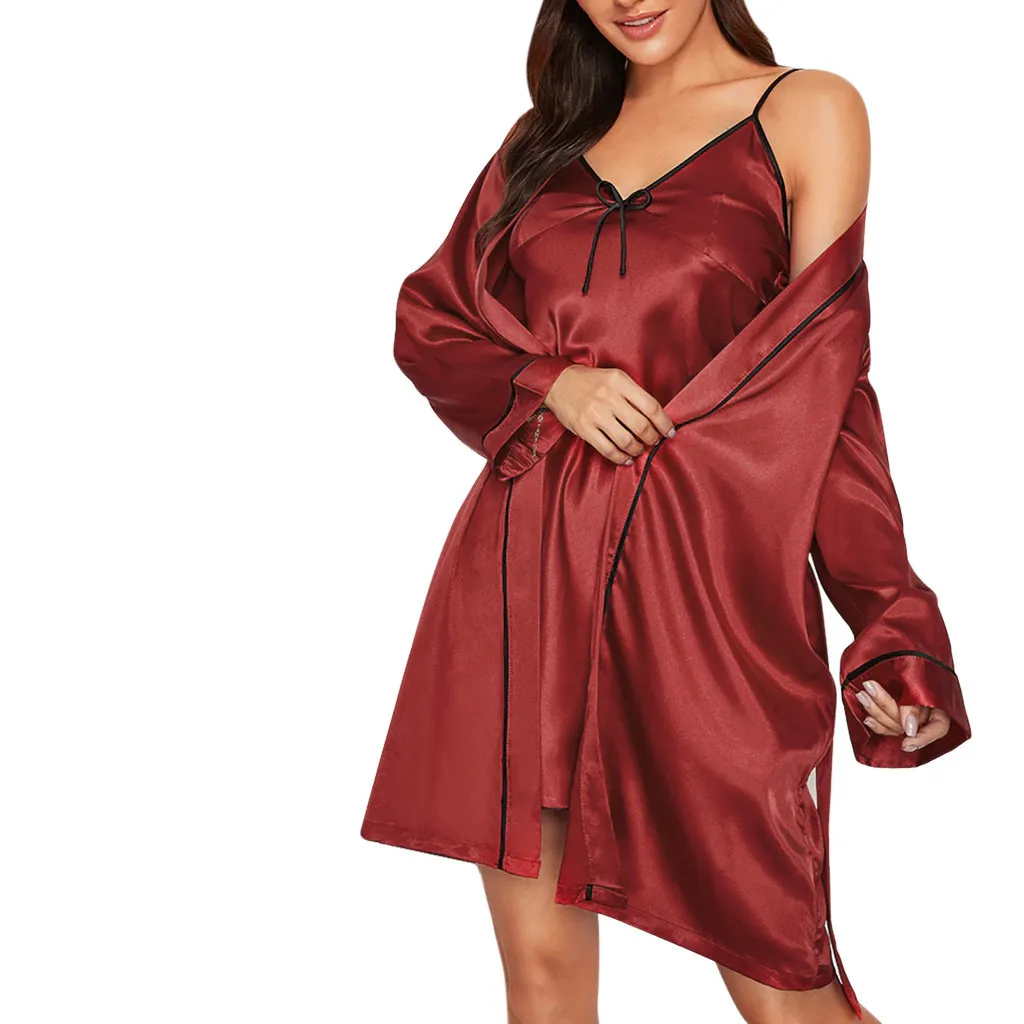 Sexy Women's Robe Set Satin Bathrobe+Night Dress Lingerie Nightwear Long Sleeve Sexy Sleepwear Dres